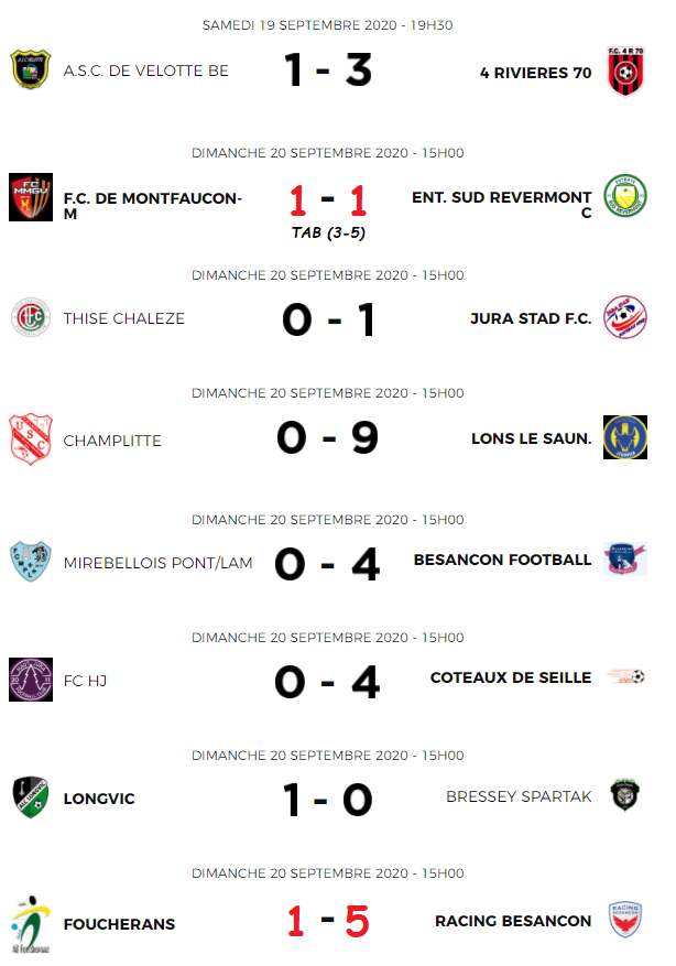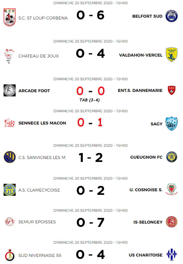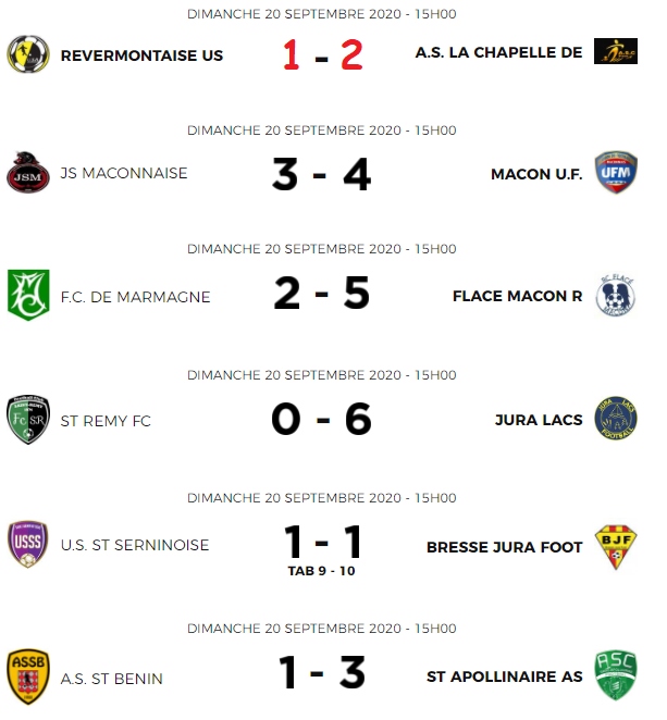 Si Gueugnon et l’UFM ont assuré l’essentiel, respectivement à Sanvignes (1-2) et face à la JS Mâconnaise (4-3), Saint Sernin (R1) sort de la compétition après un match nul 1-1 contre Bresse Jura Foot (10 tirs au but à 9). De son côté, La Chapelle de Guinchay drivée par Bruno N’Gotty se qualifie après son succès à Revermont (1-2).