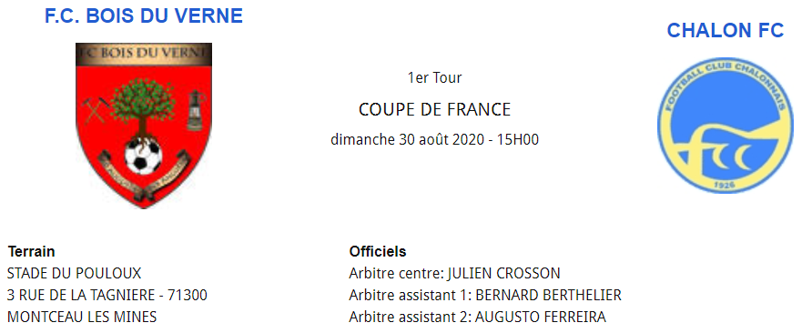Troisième focus, pour ce qui sera sans doute l’affiche la plus déséquilibrée, du moins sur le papier, de ce premier tour de coupe de France. D’un côté, le FC Bois du Verne, relégué en Départemental 3, de l’autre, Chalon, pensionnaire de Régional 1 (ex-DH) depuis plusieurs saisons. Autant dire que le rapport de force sera très largement en faveur des Chalonnais. Cependant, la coupe reste la coupe, et avant de crier victoire, il faudra affirmer sa supériorité sur le rectangle vert. Pour les banlieusards Montcelliens, il n’y aura rien à perdre, m:ais bien tout à gagner. Le plan sera sans doute de tenir le score le plus longtemps possible afin de faire douter l’adversaire. Pour Chalon, le faux pas apparaît comme interdit, disons qu’il aurait très mauvais goût.
