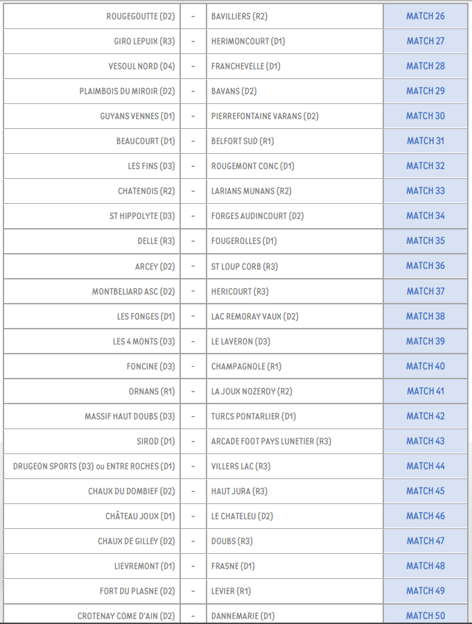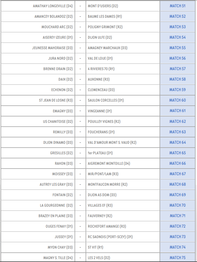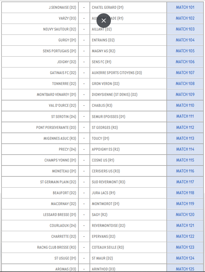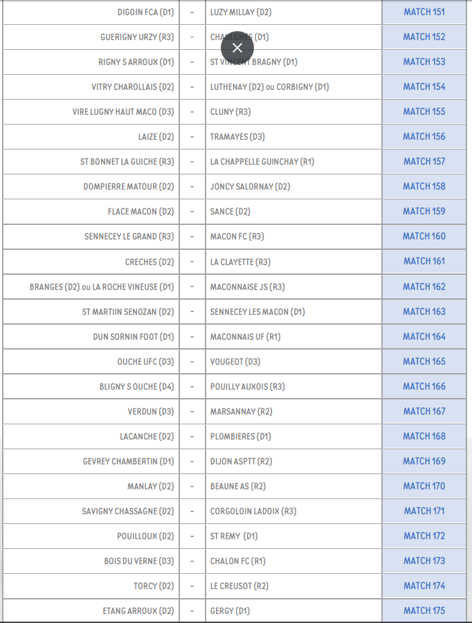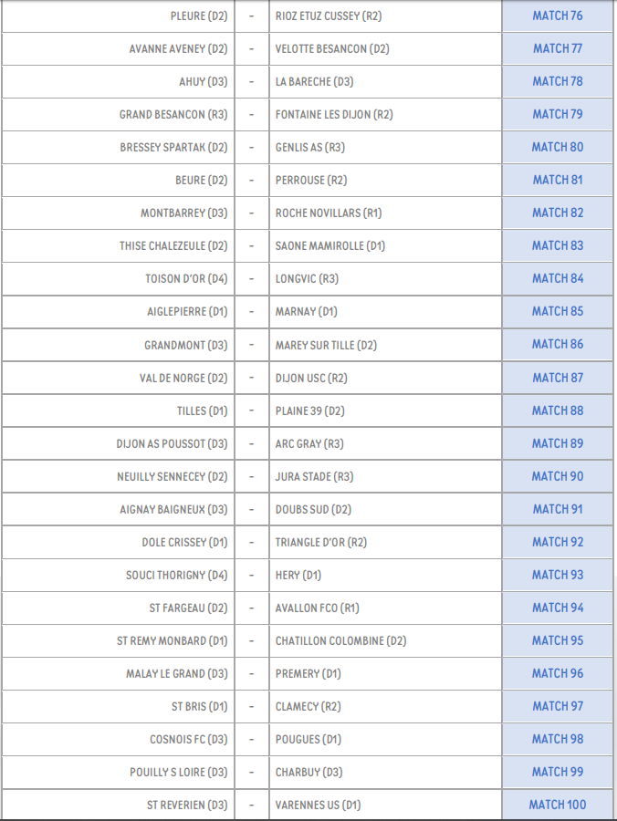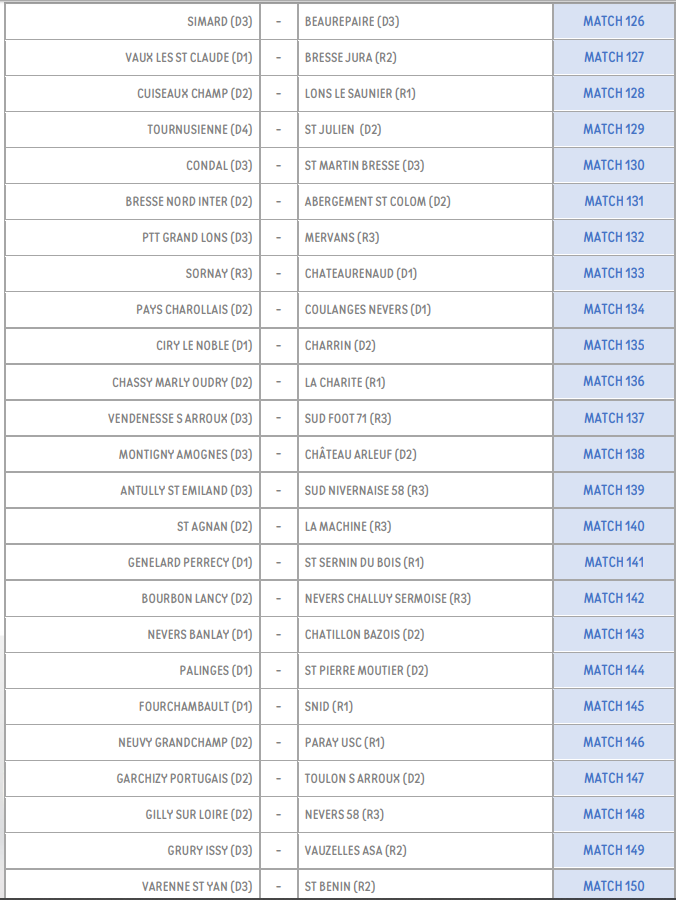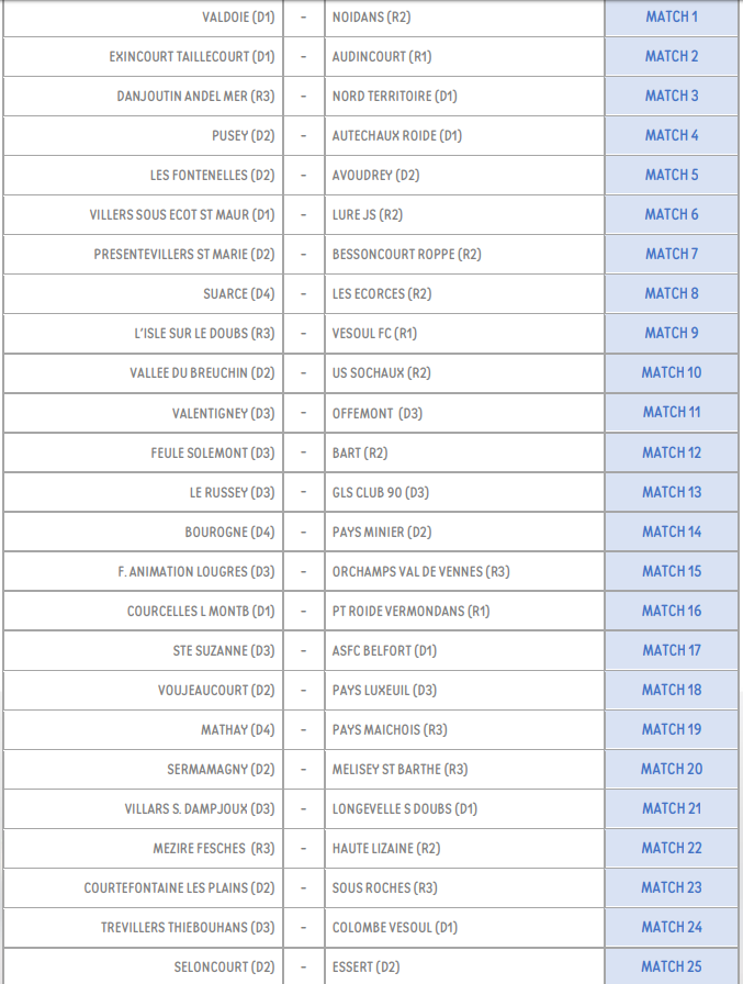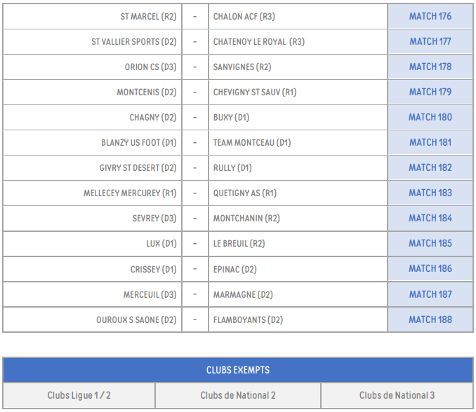 Parmi les nombreuses affiches, on notera au niveau local, les derbys mettant aux prises Blanzy (D1) à Team Montceau Foot (D1). Ou encore Torcy (D2) qui accueillera le voisin de la JO Creusot (R2). Mais aussi le choc déséquilibré sur le papier entre St Vallier (D2) et Chatenoy (R2). Il y aura des choix à faire pour le public du bassin minier. Découvrez sans plus attendre le tirage intégral de ce premier tour de coupe de France ci-dessous. Les matchs auront lieu le week-end du 29 et 30 août 2020.