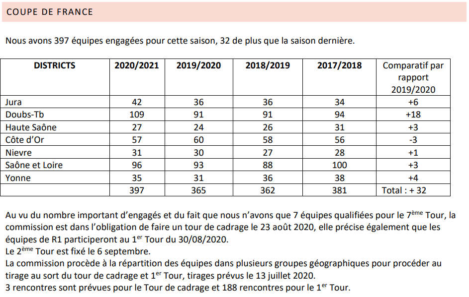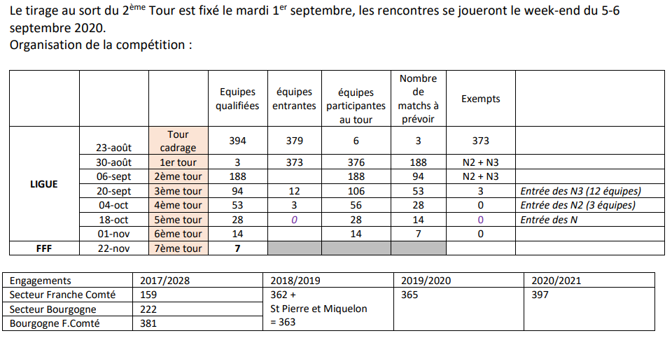 Un changement du à un problème de calendrier dans cette période post-Covid. Conséquence immédiate, la FFF a du dégager de la place. Chaque région sera impactée. Pour la Bourgogne Franche-Comté, ce seront désormais 7 et non plus 8 qualifiés pour le 7ème tour. Une place en moins pour faire simple. Par ailleurs, notez que 397 clubs (dont trois professionnels) de notre Ligue BFC sont engagés dans cette édition 2020/2021 . Et que les clubs de Régional 1 entreront en lice dès le premier tour ou tour de cadrage ! Les équipes de National 3 entreront quand à eux au stade du 3ème tour (N2 lors du 4ème tour). Ci-dessous un extrait du procès-verbal de la Ligue BFC.