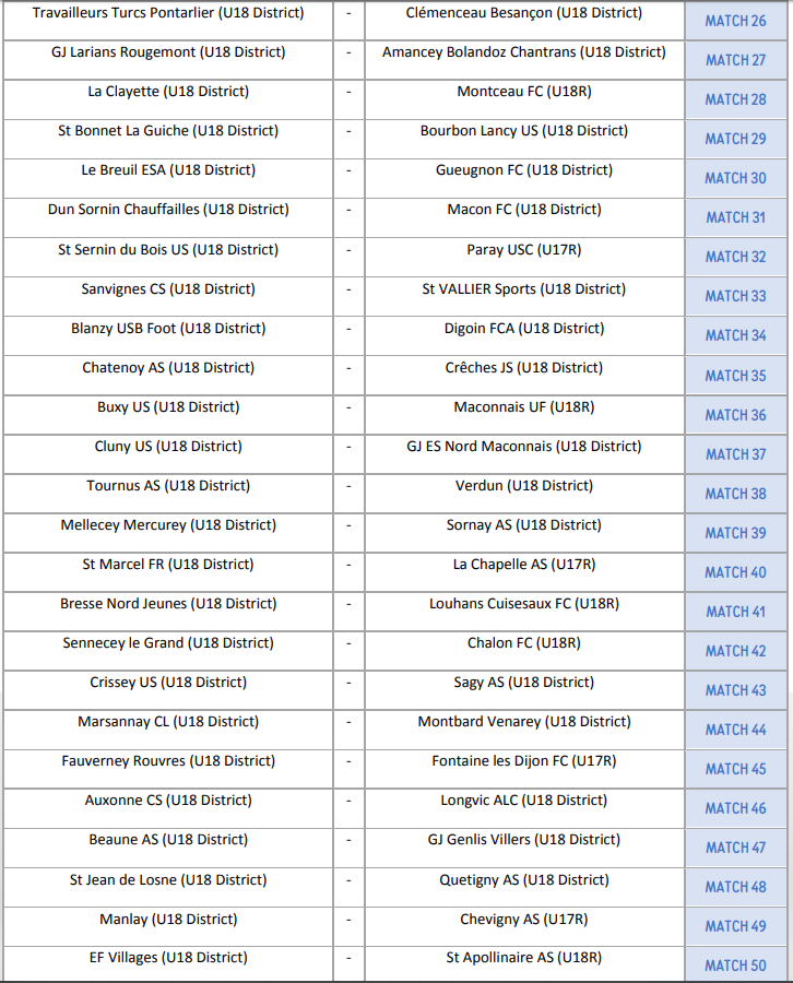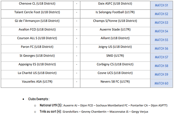 Au même titre que pour sa grande soeur Dame Coupe de France, le tirage au sort du premier tour de la coupe Gambardella était attendu. En effet, après les calendriers en championnat, les clubs savent désormais quel sera leur premier adversaire cette saison. Rappelons par ailleurs que cette compétition concerne la catégorie U18. En outre, sont exemptés, les clubs évoluant en championnat U19 National. Mais aussi, quatre équipes tirés au sort, à savoir Gergy, JS Mâconnaise, Grandvillars et Gevrey Chambertin.
