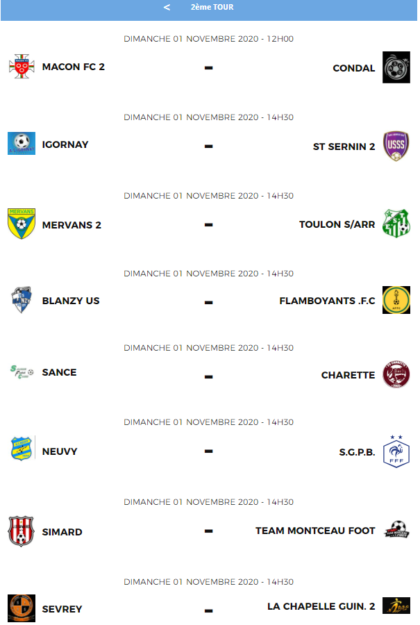 Coupe Sport COMM. Après un premier tour disputé au début du mois, où les équipes évoluant en Départemental 1 et/ou en coupe de France étaient exemptées, le District Saône-et-Loire de Football a dévoilé ce jeudi 1er octobre l’ensemble des affiches du deuxième tour de l’épreuve. Un tirage au sort comprenant donc l’entrée en lice des formations de D1. Les trente-cinq rencontres auront lieu le dimanche 1er novembre prochain. Découvrez sans plus attendre ci-dessous le tirage au sort intégral. Pour les clubs non tirés, direction le troisième tour ! En effet, il faut savoir que les premiers tours servent souvent de cadrage afin d’aboutir à une formule type 1/8ème de finale.