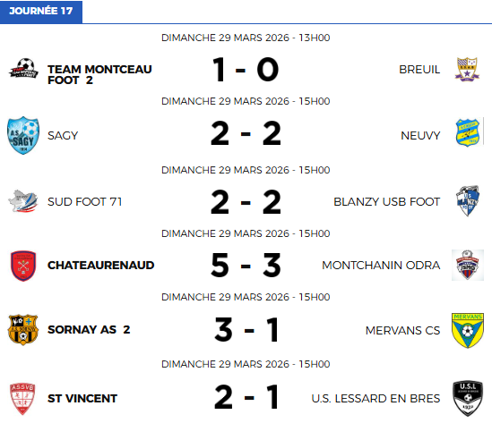 Dans les autres matchs, à noter la victoire de Chateaurenaud à domicile contre Montchanin (5-3). Après plusieurs contre-performances, qui l’ont écartées de la tête du classement, le SCC retrouve enfin le plaisir de la victoire et les trois points qui vont avec. De quoi reprendre la 6ème place aux dépens de Lessard. Enfin, le dernier rendez-vous de cette dix-septième journée opposait deux équipes de bas de tableau. À savoir Sagy et Neuvy. Au terme d’un duel âpre et disputé, les deux équipes se quittent dos à dos (2-2). Un résultat qui au final n’arrange personne, surtout après les victoires surprises de TMF B et Sornay B.