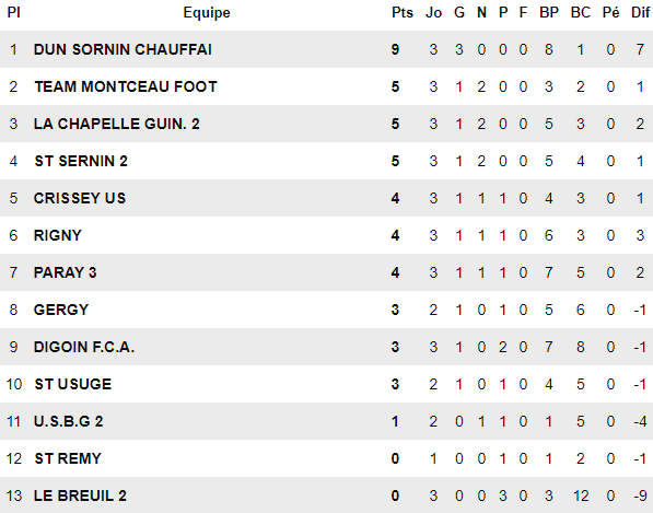 Avec ce troisième succès en autant de journées, Dun Sornin Chauffailles creuse un premier écart avec ses poursuivants les plus proches. En effet, quatre points séparent désormais le leader d’un trio composé de La Chapelle de Guinchay B, St Sernin B et Team Montceau Foot. Ces trois-là s’étant imposés ce dimanche. À commencer par le TMF qui accueillait Crissey sur la pelouse détrempée du Magny. Une rencontre plaisante et équilibrée entre deux équipes joueuses. Au final, les Montcelliens l’emportent sur la plus petite des marges (1-0), grâce à un but plein d’opportunisme de l’entrant Romano Bardi sur un service de Mohamed Bouazzaoui. Le portier visiteur n’étant pas exempt de tout reproche sur ce coup-là.