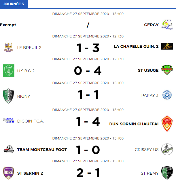 Dans les autres matchs, à noter le large succès du promu Saint Usuge à St Bonnet face à l’USBG B (0-4). Un non-match des locaux qui encaisseront trois buts sur contre attaque et un autre sur corner. Les buts Bressans étant l’œuvre de Anthony Glod et Guillaume Labouriaux auteur d’un triplé. Enfin, dans un match de haut de tableau, Rigny et Paray C se quittent dos à dos (1-1).