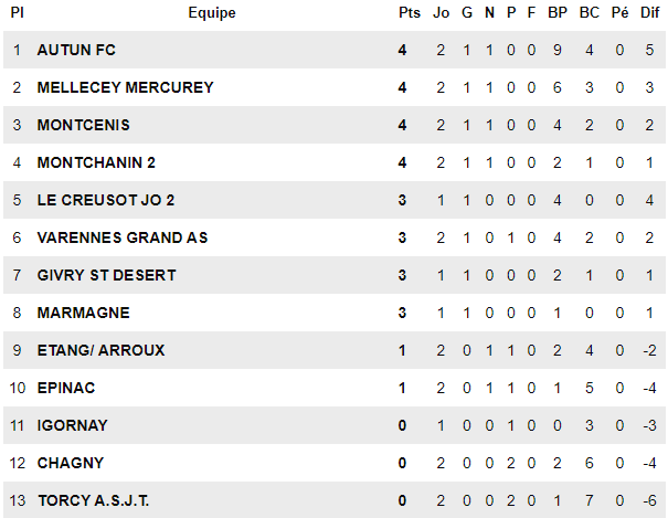 Ce dimanche, deux poules seulement de Départemental 2 avaient rendez-vous avec la deuxième journée de championnat. Et pour cause, celles-ci étant composées de treize équipes (au lieu de douze d’ordinaire), il faut dégager deux dates supplémentaires dans le calendrier (24 journées sur la saison au lieu de 22). Ceci étant dit, retour sur les matchs de ce dimanche dans les Poules C et D. Avec notamment le large succès de Autun face à Torcy, mais aussi celui de Demigny à Ouroux. Des succès qui offrent la première place au classement à ces deux équipes, au soir de la deuxième journée. Décryptage.