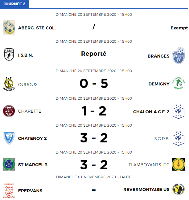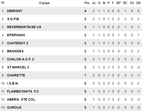 Dans la poule D de Départemental 2, Demigny s’empare de la première place au classement, à la faveur de son large succès ramené d’Ouroux (0-5 et 0-2 à la pause). Les coéquipiers du nouveau venu Tommy Marolleau (ex-Chagny) n’ont laissé aucune chance aux joueurs de la JSO. Notez par ailleurs le report du match devant opposer ISBN à Branges. L’ESB étant un prétendant aux premières places cette saison dans cette poule D. Derrière le leader Demigny (4 pts), on ne retrouve pas moins de sept équipes comptant trois points au soir de la deuxième journée.