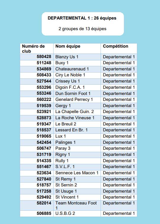 Ce jeudi, la Commission des Compétitions du District Saône-et-Loire de Football a validé la liste des équipes engagées dans les championnats Seniors Garçons de Départemental 1, 2 et 3. En outre, l’instance a également dévoilé la pyramide des compétitions définitive de la saison à venir. Avec notamment, deux poules de 13 en D1 et sept groupes de 12 en D3. Décryptage.