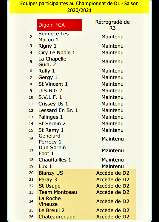 Cet ordre permet de déterminer quelles seront les deux poules (voir image plus haut). Même si deux équipes peuvent s’accorder pour changer de groupe, peu importe le motif. En outre, une incertitude réside. En effet, quid de la fusion entre Dun Sornin et Chauffailles, maintenus en D1 à l’issue de la saison. Car ces deux-là ne feront plus qu’un à la reprise, sous le nom de « Dun Sornin Chauffailles Brionnais ». À priori, Dun Sornin absorbant dans les faits le club du CO Chauffailles (PV de la Ligue), on devrait avoir une poule A à 13 équipes (celle initialement prévue pour DSF) et une poule B à 12 équipes.
