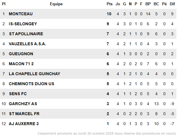 Classement actuel de la poule A de Régional 1 Herbelin.