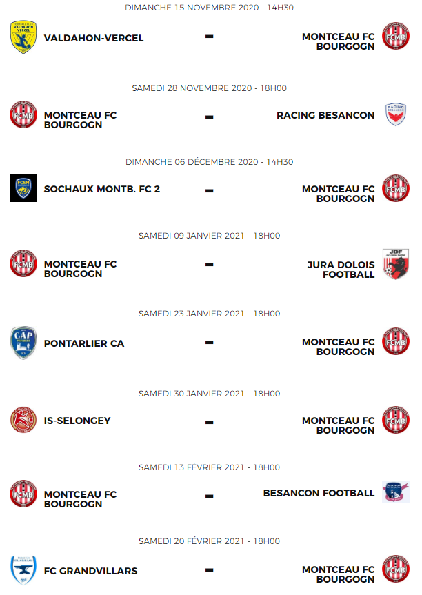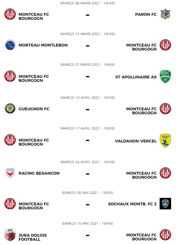 Ils étaient attendus, les voilà. Après le tirage au sort du premier tour de la coupe de France, les clubs évoluant au niveau régional sont désormais fixés sur le calendrier de la saison en championnat. Le cas notamment pour le FCMB, Gueugnon, ainsi que Sanvignes, Montchanin, Le Creusot, Le Breuil et bien d’autres encore. La liste est bien évidemment non-exhaustive ici. Retrouvez tous les calendriers complets (en lien) dans cet article.