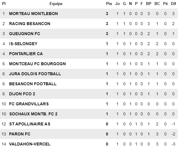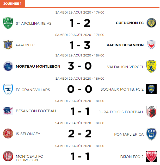 D’abord par M’Changama de la tête, suite à un superbe coup franc direct d’El Katch (1-2, 81′). Puis grâce à un missile de Bikong Ngue (1-3, 88′). À noter par ailleurs le match nul prolifique en buts entre Is Selongey et Pontarlier (2-2). Pas de vainqueur non plus entre Besançon Foot et Jura Dolois, dans un des chocs du jour. Tandis que personne n’a trouvé la faille dans le duel opposant Sochaux B et Grandvillars. Prochaine journée le week-end prochain.