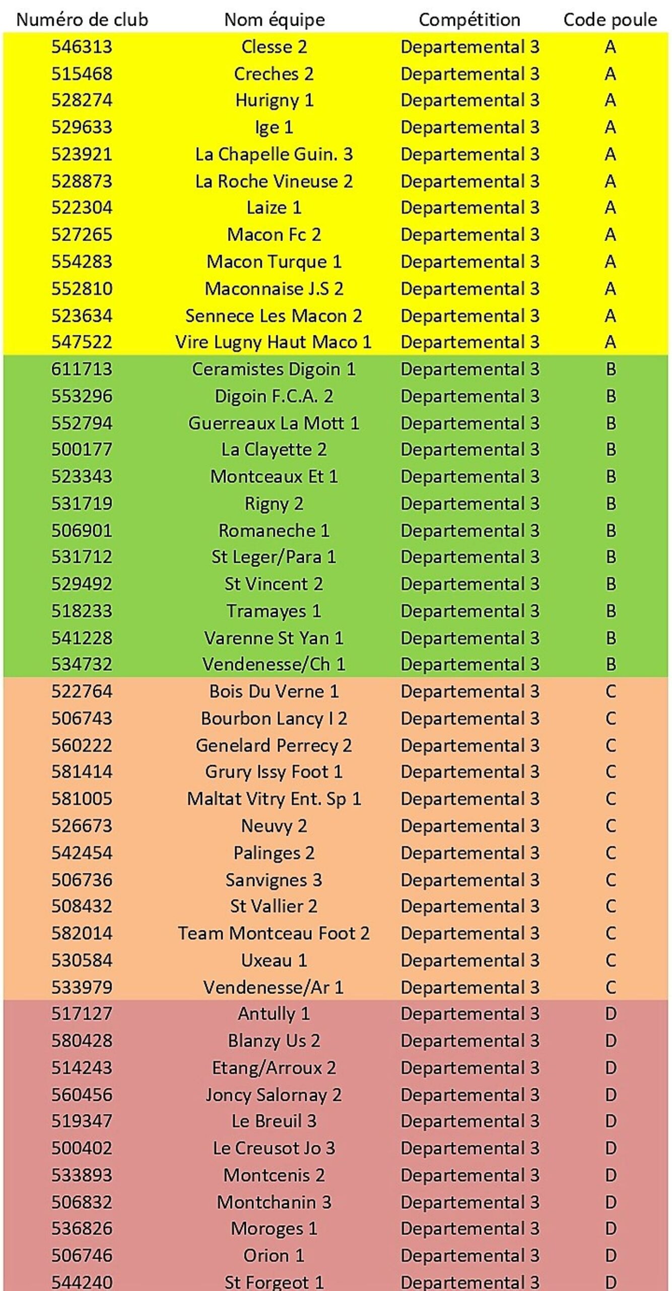 C’est désormais officiel. Le District Saône et Loire de Football a publié sur son site internet ce mardi, la composition des poules de Départemental 1, D2 et D3. Toutefois, les clubs peuvent encore demander à changer de groupe, en cas d’accord commun avec une autre équipe. Découvrez sans plus attendre, les deux poules de D1, les 4 de D2 et les sept groupes de D3. Décryptage.